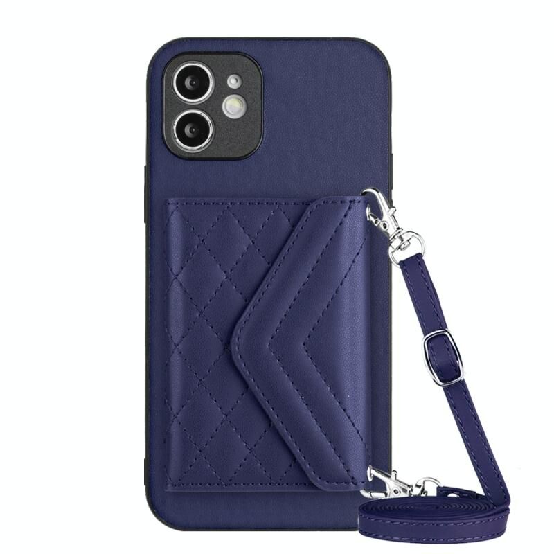 For iPhone 12 mini Rhombic Texture Card Bag RFID Phone Case with Long Lanyard(Blue)