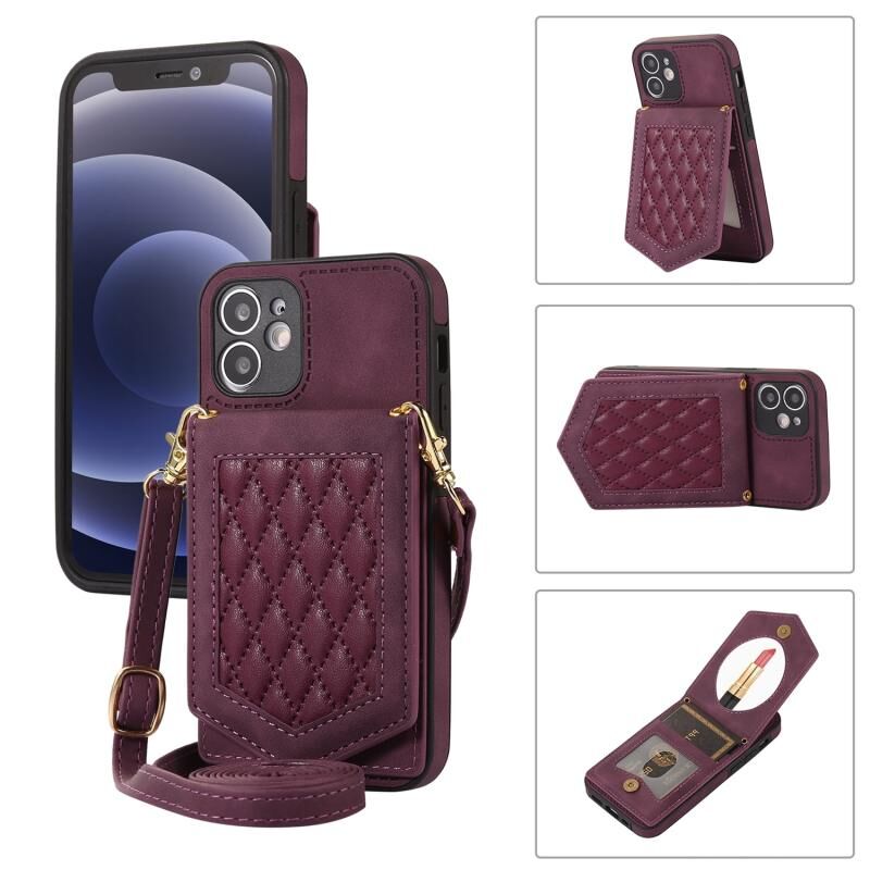 For iPhone 12 mini Rhombic Texture RFID Phone Case with Lanyard & Mirror(Wine Red)