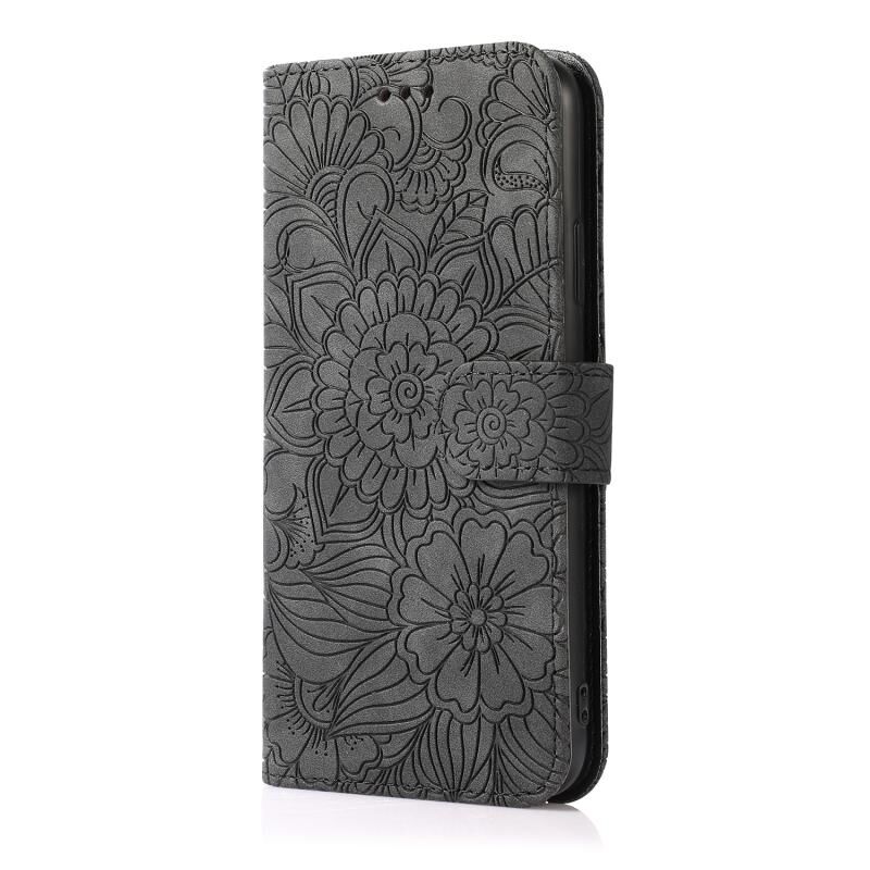 Θήκη δέρματος οριζόντιας αναδίπλωσης για iPhone 12 mini με υφή δέρματος, ανάγλυφο ηλίανθο, με βάση στήριξης, θήκες για κάρτες, πορτοφόλι & λουρί (Μωβ)