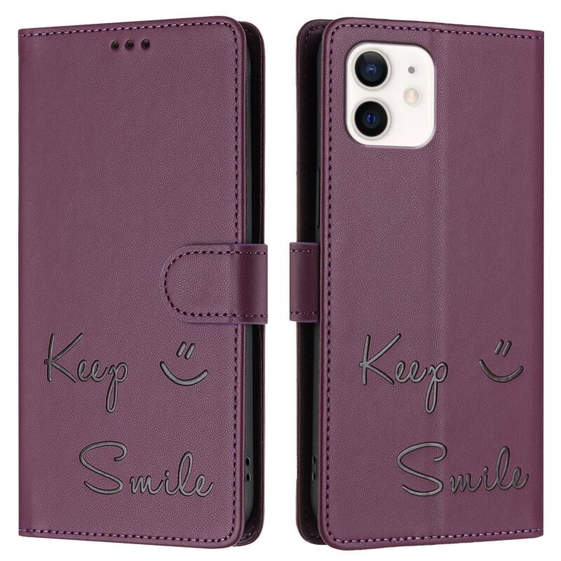 Θήκη τηλεφώνου δερμάτινη με ανάγλυφο χαμόγελο και προστασία RFID για iPhone 12 mini (Βιολετί)