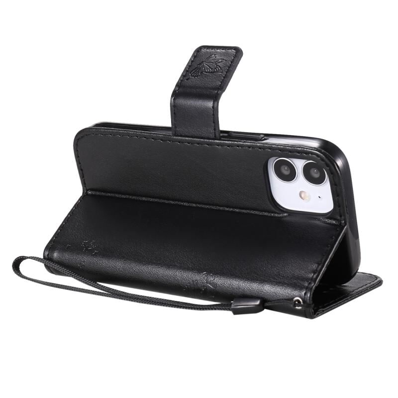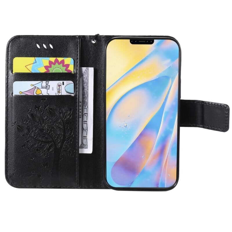 Θήκη για iPhone 12 mini με ανάγλυφο σχέδιο Δέντρου & Γάτας, οριζόντια, από δέρμα με βάση στήριξης & θήκες για κάρτες & πορτοφόλι & κορδόνι (Χρυσό Ροζ)