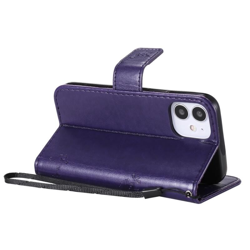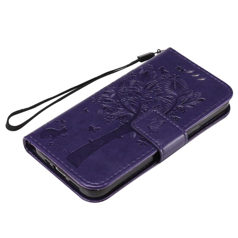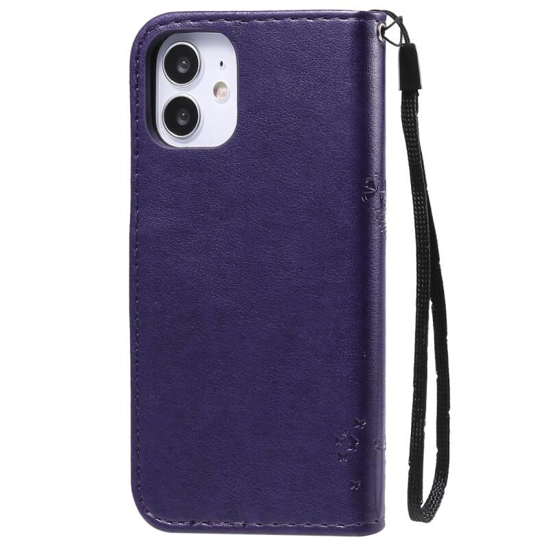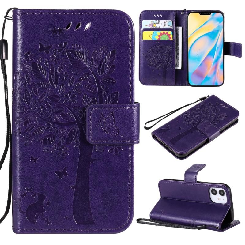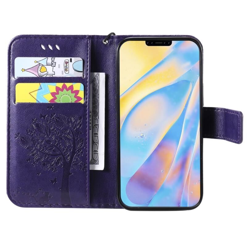 Θήκη για iPhone 12 mini με ανάγλυφο σχέδιο Δέντρου & Γάτας, οριζόντια, από δέρμα με βάση στήριξης & θήκες για κάρτες & πορτοφόλι & κορδόνι (Χρυσό Ροζ)