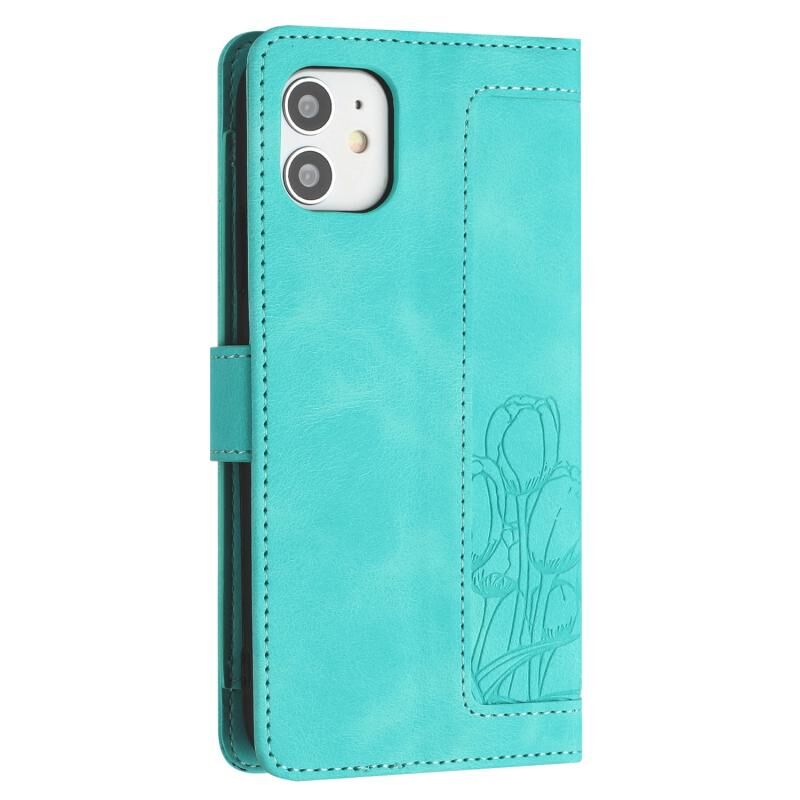For iPhone 12 mini Tulips Embossed Leather Phone Case with Lanyard(Green)