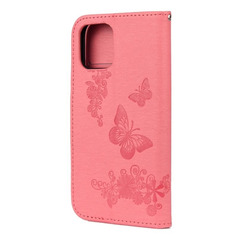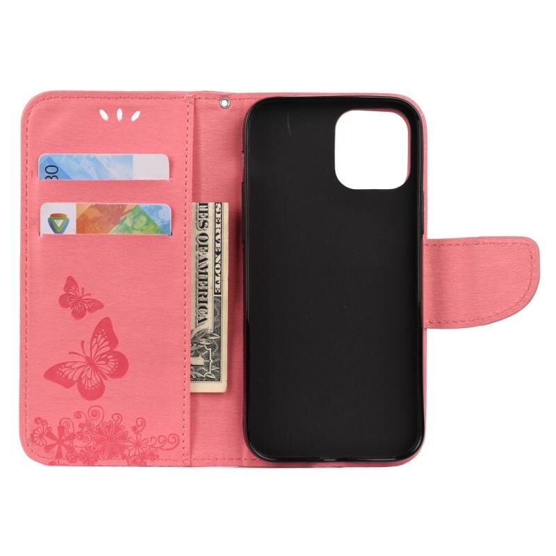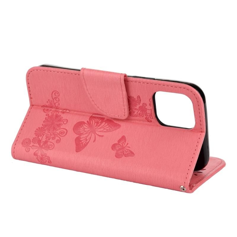 Θήκη για iPhone 12 mini Vintage με ανάγλυφο floral σχέδιο πεταλούδας, οριζόντια, από δέρμα με θήκη για κάρτες, στήριξη, πορτοφόλι και λουρί (Ροζ)