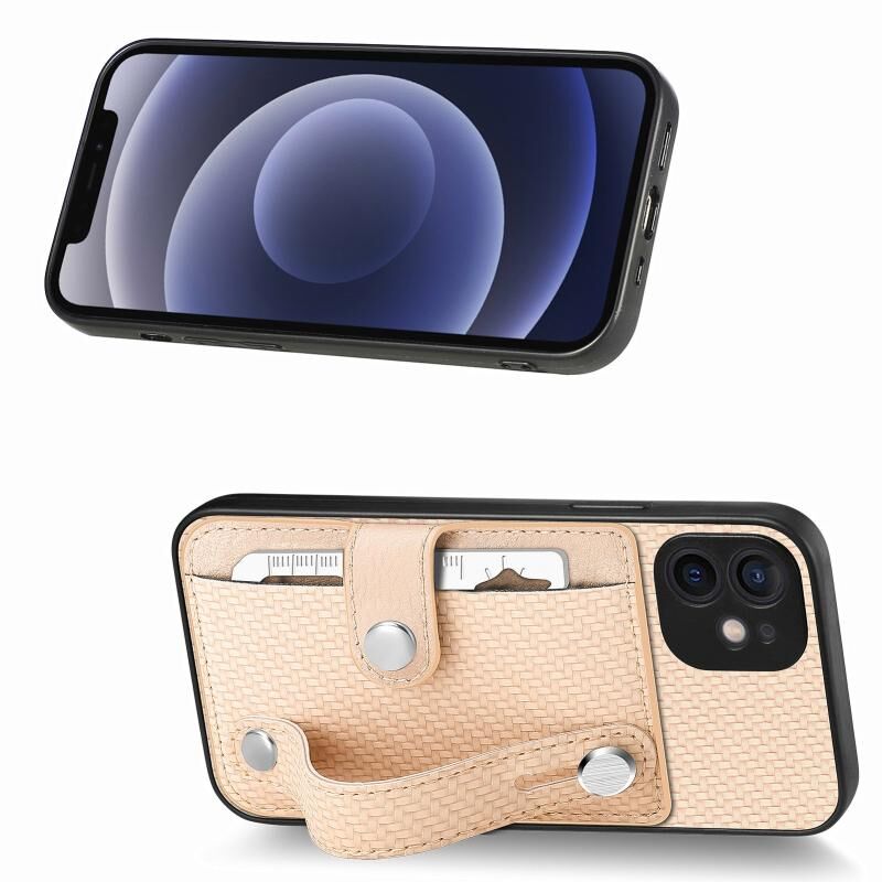 For iPhone 12 mini Wristband Kickstand Card Wallet Back Cover Phone Case with Tool Knife(Khaki)