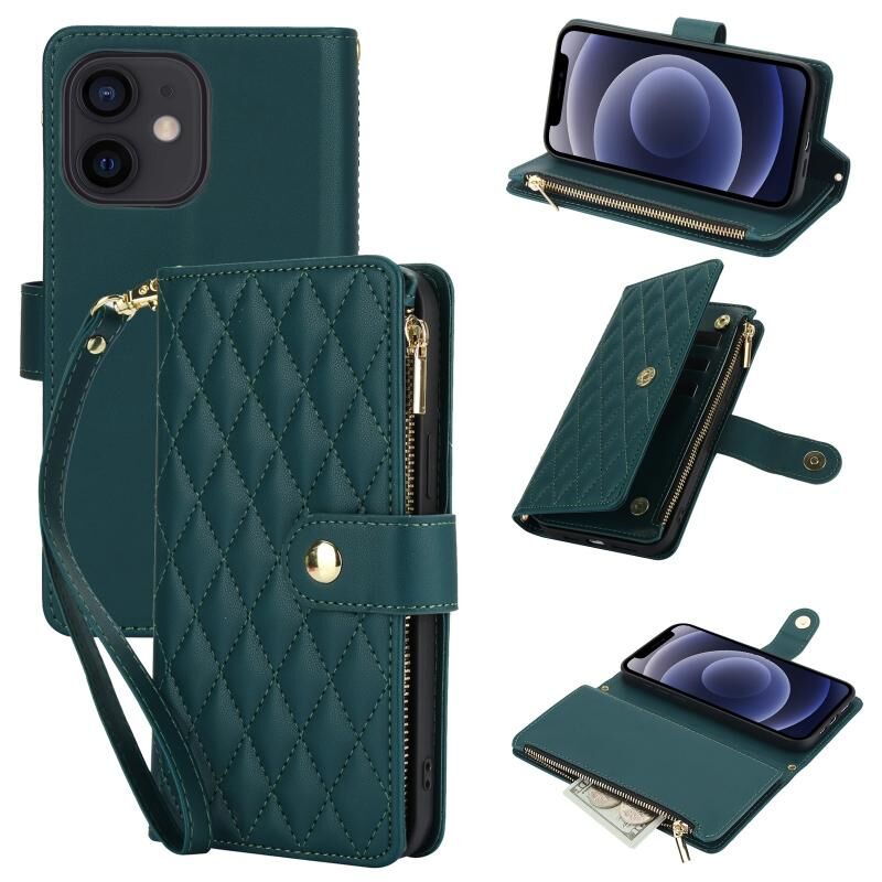 For iPhone 12 mini YM016 Rhombic Zipper Card Wallet Leather Phone Case with Lanyard(Green)