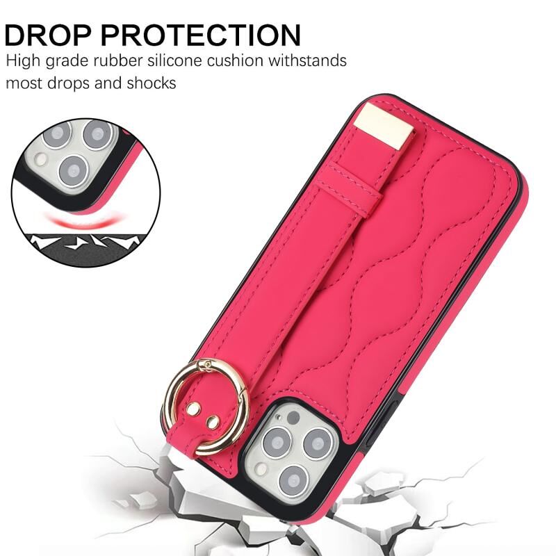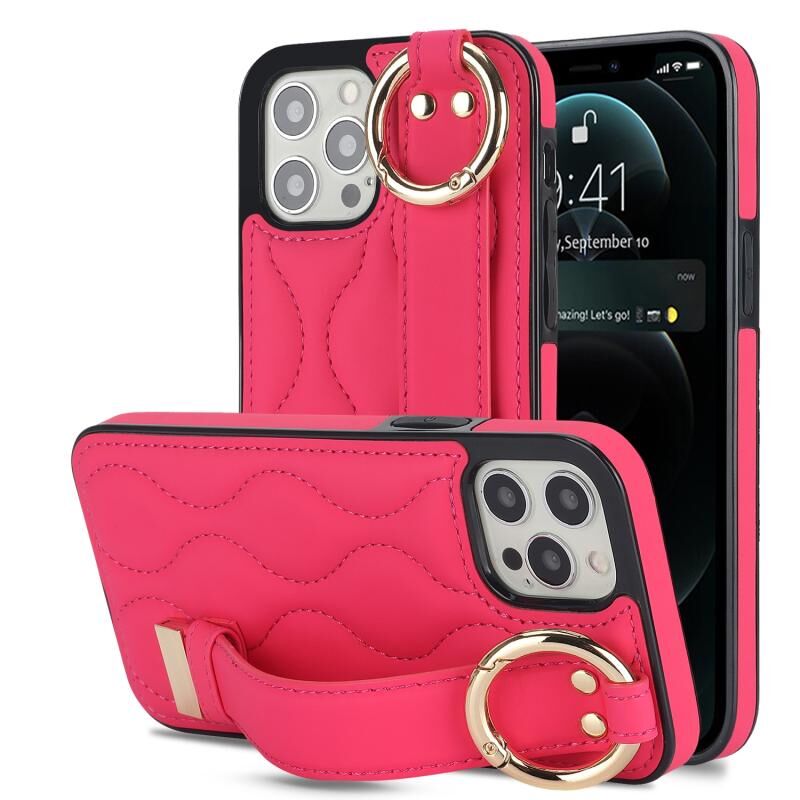 For iPhone 12 Pro / 12 Non-slip Full Coverage Ring PU Phone Case with Wristband(Rose Red)