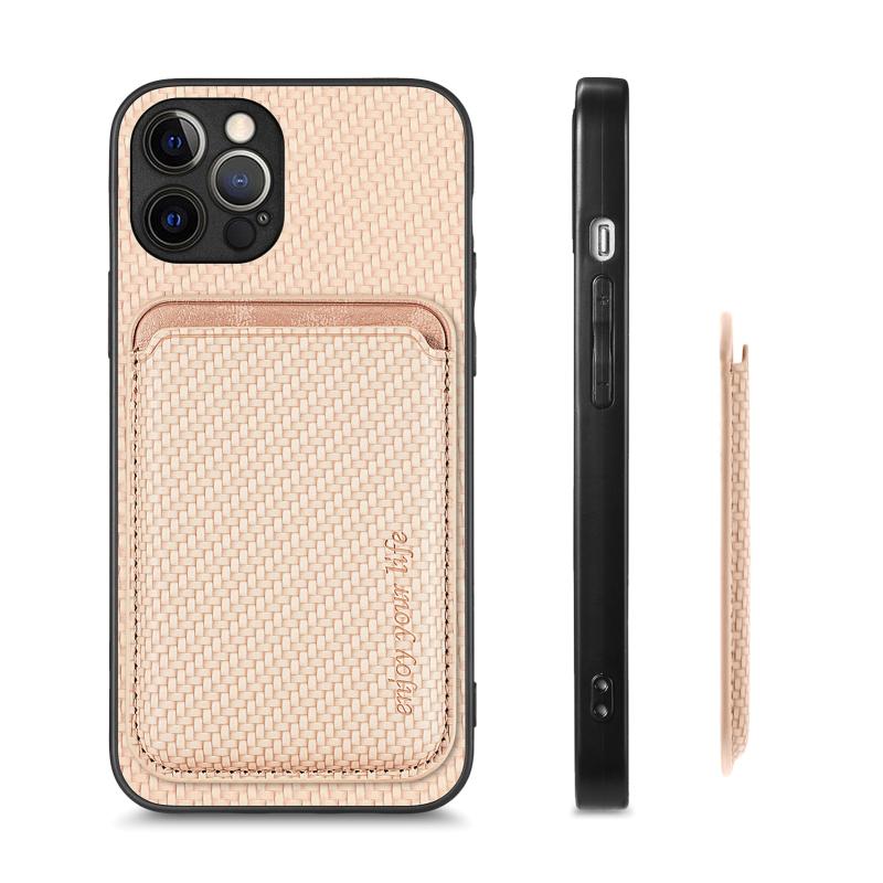 For iPhone 12 Pro Carbon Fiber Leather Card Magsafe Magnetic Phone Case(Khaki)