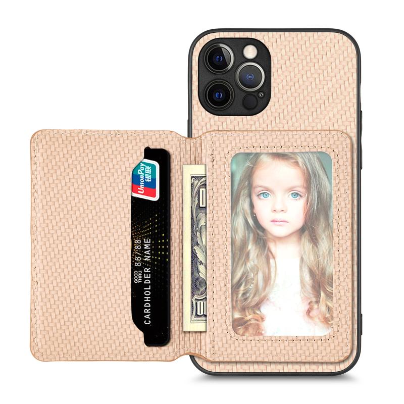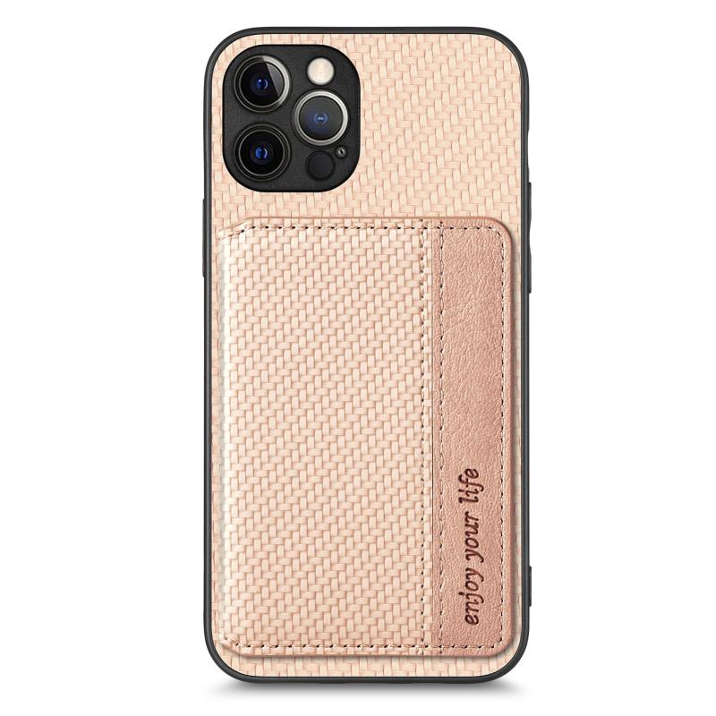 For iPhone 12 Pro Carbon Fiber Magnetic Card Bag Phone Case(Khaki)