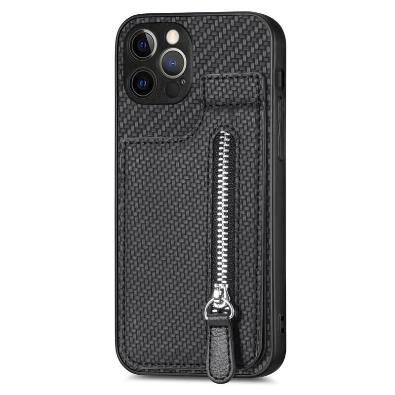 For iPhone 12 Pro Carbon Fiber Vertical Flip Zipper Phone Case(Black)