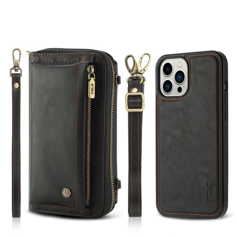 Θήκη τηλεφώνου από δέρμα, πολλαπλών λειτουργιών με φερμουάρ και λουρί για iPhone 12 Pro (Καφέ)
