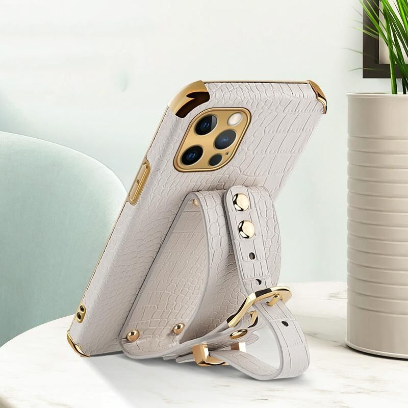 For iPhone 12 Pro Electroplated TPU Crocodile Pattern Leather Case with Wrist Strap(White)