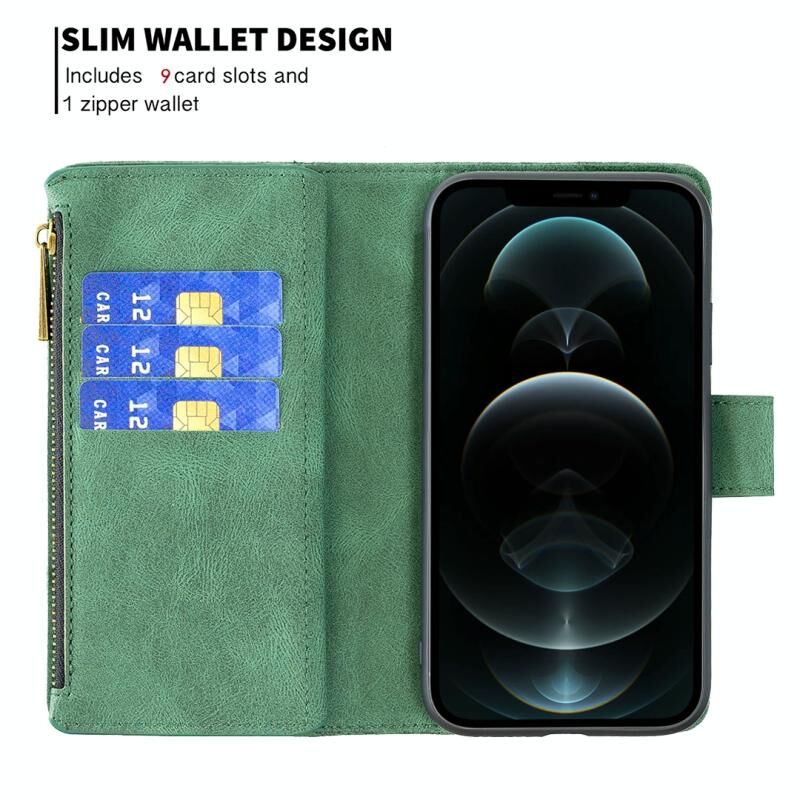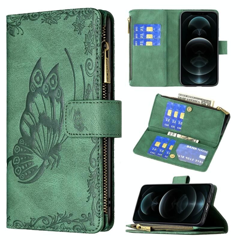 For iPhone 12 Pro Flying Butterfly Embossing Pattern Zipper Horizontal Flip Leather Case with Holder & Card Slots & Wallet(Green)