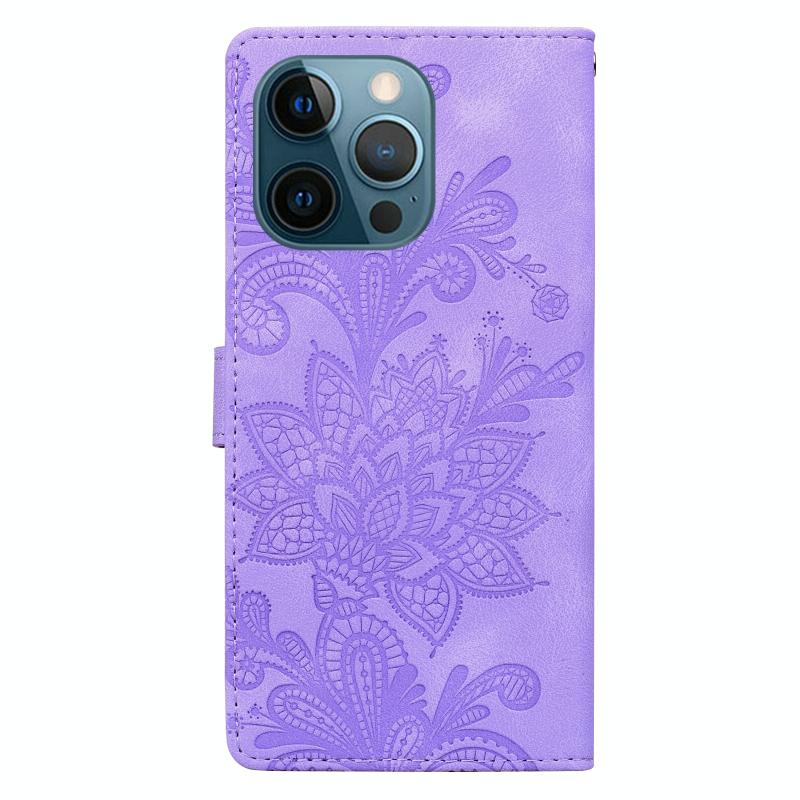 For iPhone 12 Pro Max / 13 Pro Max Lace Floral Embossed Magnetic Buckle PU Phone Case With Wrist Strap(Purple)