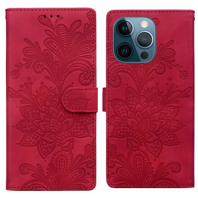 Θήκη τηλεφώνου από PU με μαγνητικό κούμπωμα και ανάγλυφο σχέδιο δαντέλας λουλουδιών για iPhone 12 Pro Max / 13 Pro Max με λουρί καρπού (Πράσινο)