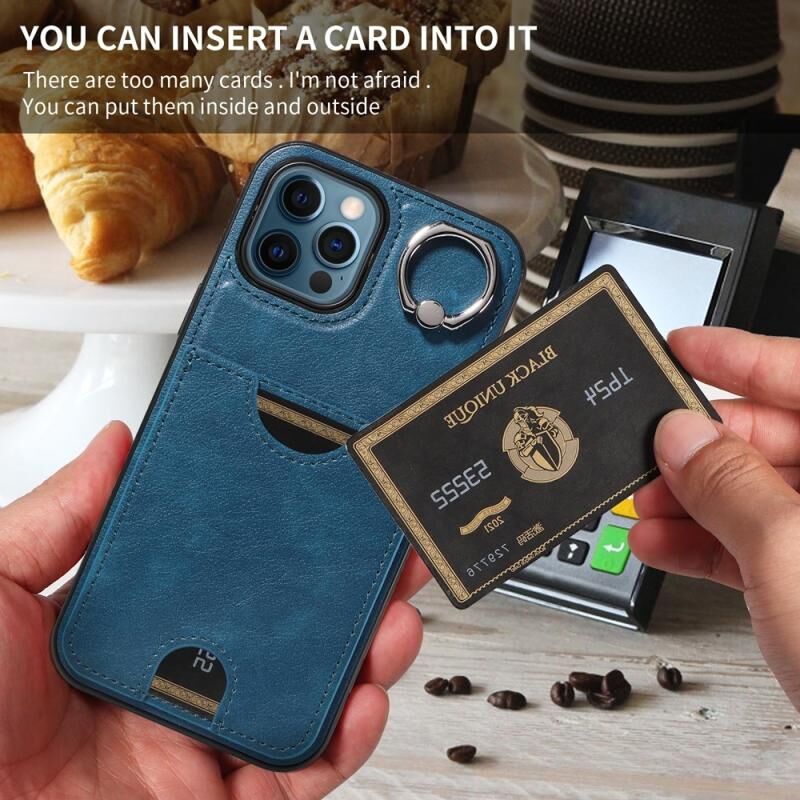 Θήκη τηλεφώνου για iPhone 12 Pro Max με υφή δέρματος μοσχαριού, θήκη κάρτας και δαχτυλίδι στήριξης (Μπλε)