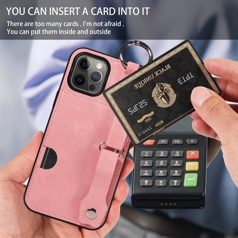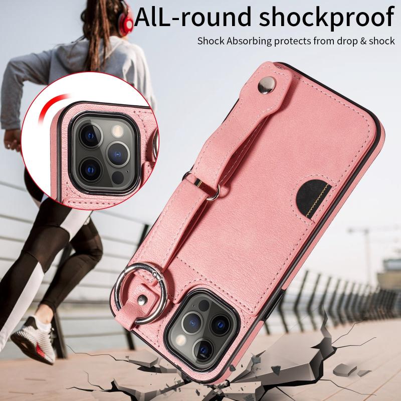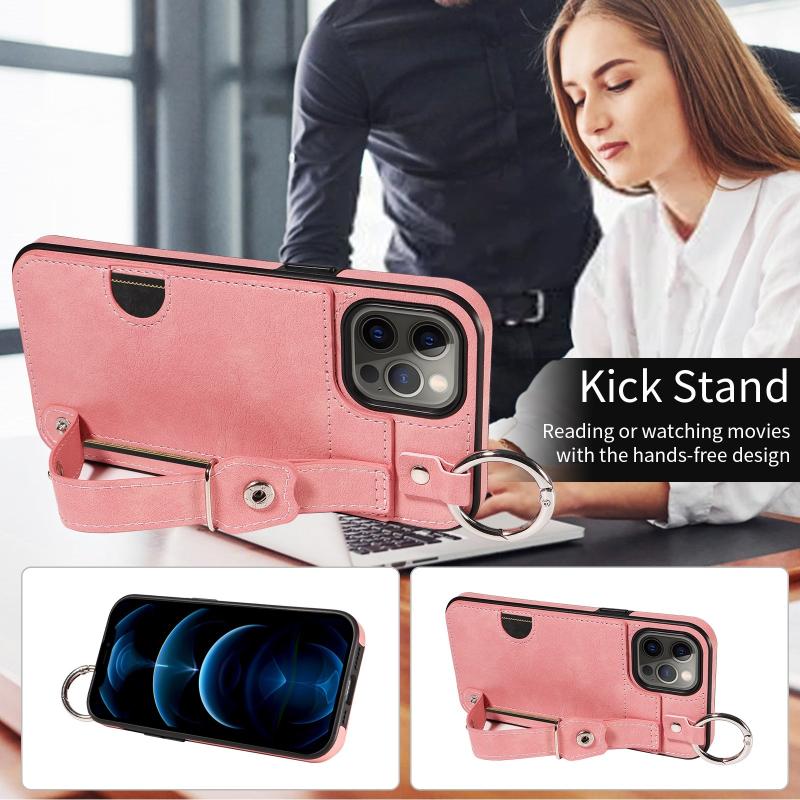 For iPhone 12 Pro Max Calf Texture Wrist Card Slot Ring Phone Case(Pink)