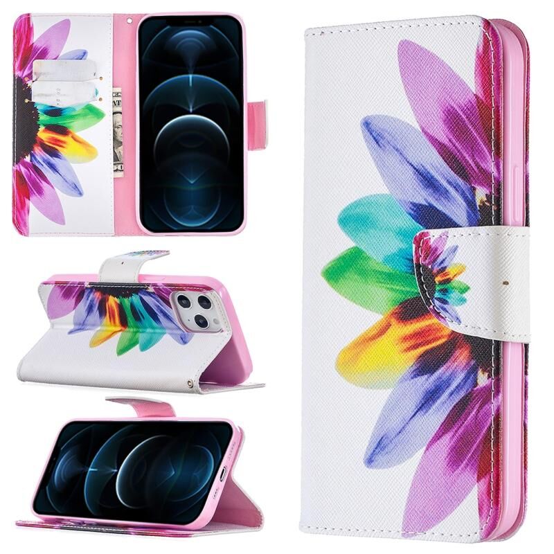 Θήκη δέρματος οριζόντιας αναδίπλωσης με σχέδιο πολύχρωμης ζωγραφικής για iPhone 12 Pro Max με βάση & θήκες καρτών & πορτοφόλι (Ηλίανθος)