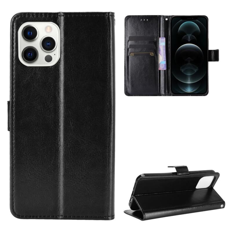 Θήκη δέρματος οριζόντιας αναδίπλωσης για iPhone 12 Pro Max με υφή Crazy Horse, με βάση, θήκες καρτών, πορτοφόλι και κορδόνι (Μαύρο)