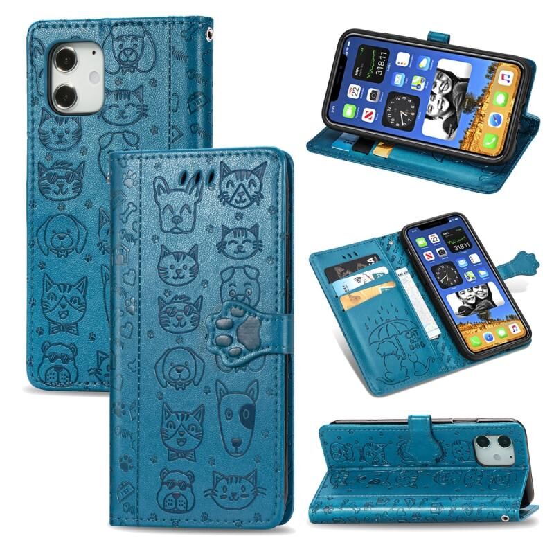 Θήκη δέρματος οριζόντιας αναδίπλωσης για iPhone 12 Pro Max με χαριτωμένα ανάγλυφα σχέδια γάτας και σκύλου, με βάση, θήκες καρτών, πορτοφόλι και λουρί (Ροζ)