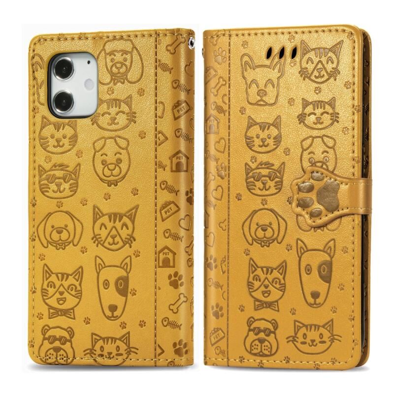 Θήκη δέρματος οριζόντιας αναδίπλωσης για iPhone 12 Pro Max με χαριτωμένα ανάγλυφα σχέδια γάτας και σκύλου, με βάση, θήκες καρτών, πορτοφόλι και λουρί (Ροζ)
