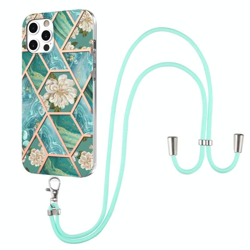 For iPhone 12 Pro Max Electroplating Splicing Marble Flower Pattern TPU Shockproof Case with Lanyard(Blue Flower)