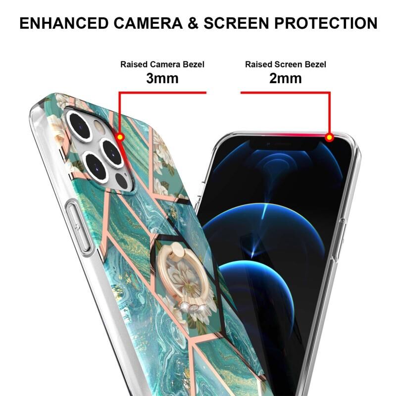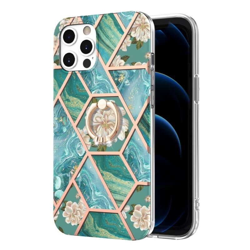 For iPhone 12 Pro Max Electroplating Splicing Marble Flower Pattern TPU Shockproof Case with Rhinestone Ring Holder(Blue Flower)