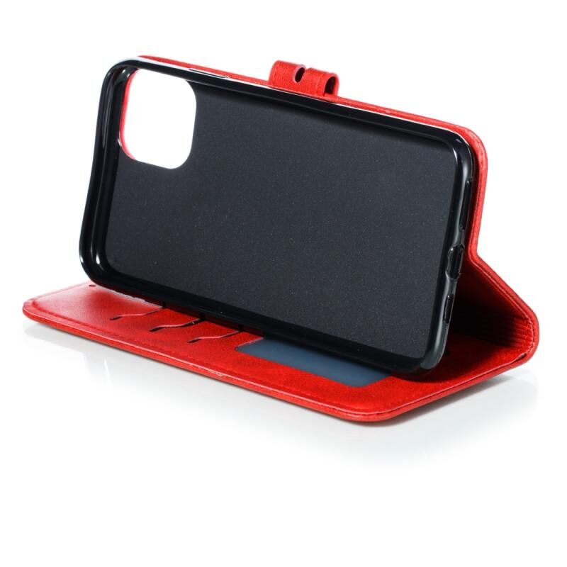Θήκη δέρματος οριζόντιας αναδίπλωσης για iPhone 12 Pro Max με ανάγλυφο σχέδιο χαρούμενης γάτας, με βάση στήριξης & θήκες για κάρτες & πορτοφόλι & κορνίζα φωτογραφιών (Κόκκινο)