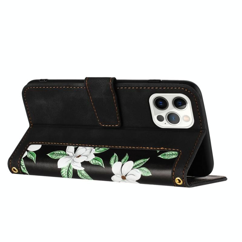 Θήκη τηλεφώνου από δέρμα με λουλουδάτο σχέδιο για iPhone 12 Pro Max με κορδόνι (Μαύρο)