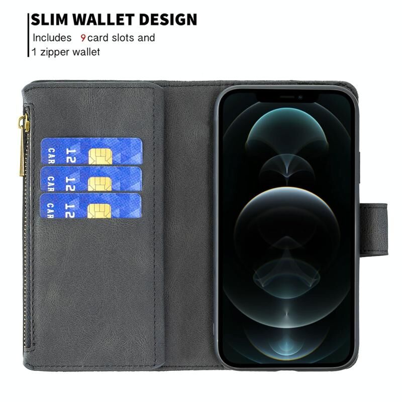 Θήκη για iPhone 12 Pro Max, Δερμάτινη οριζόντια με φερμουάρ, με ανάγλυφο σχέδιο πεταλούδας, με θήκη και υποδοχές για κάρτες & πορτοφόλι (Καφέ)