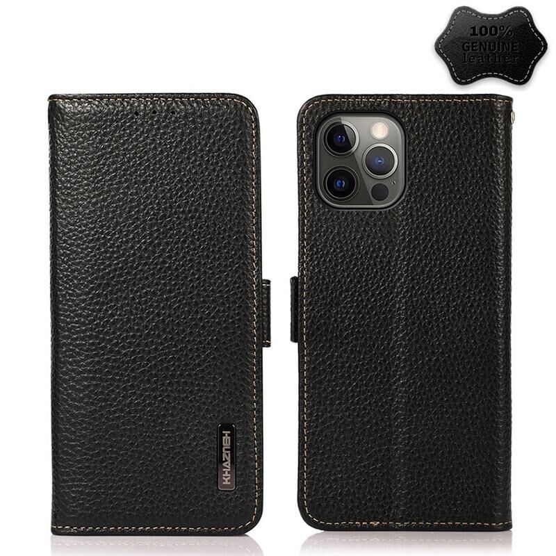 Θήκη KHAZNEH για iPhone 12 Pro Max με πλευρική μαγνητική σύνδεση, από γνήσιο δέρμα Litchi με προστασία RFID (Μαύρο)