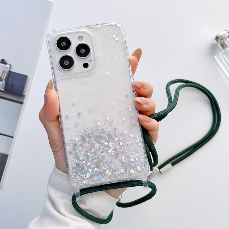 Θήκη iPhone 12 Pro Max με Λουρί, Glitter, Διαφανής Epoxy (Σκούρο Πράσινο)