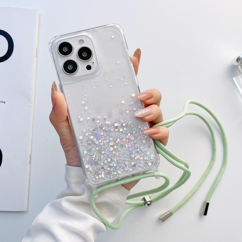 Θήκη iPhone 12 Pro Max με Λουρί, Glitter, Διαφανής Epoxy (Πράσινο)