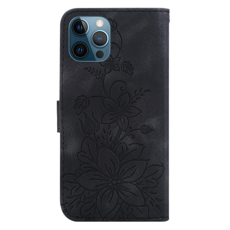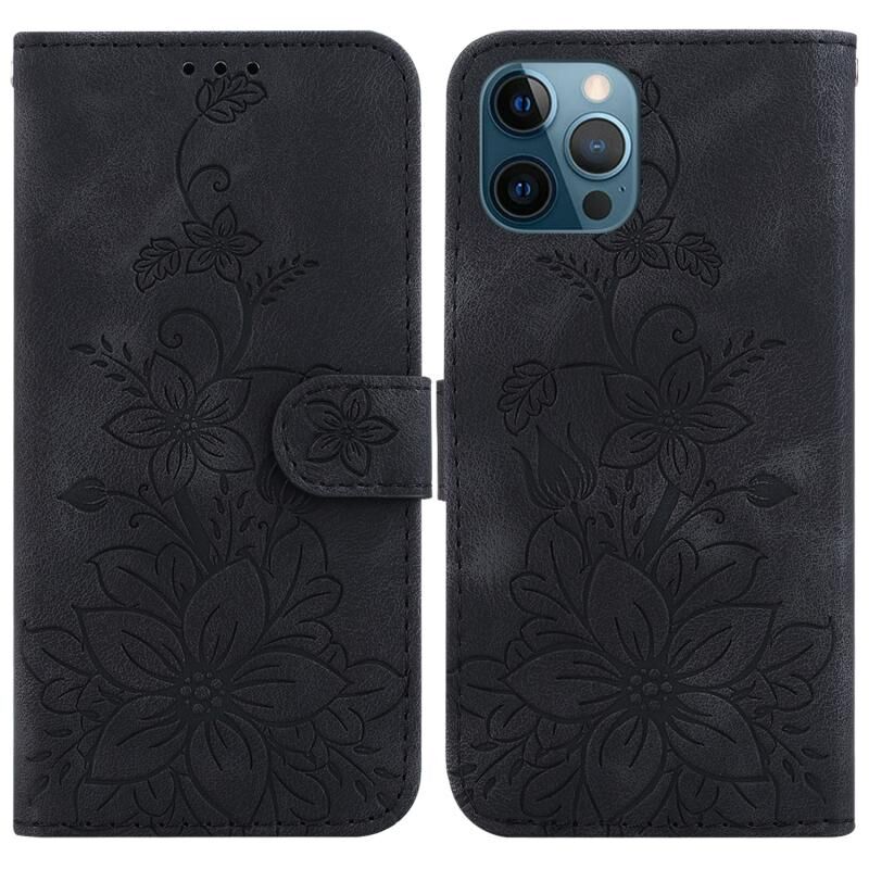 For iPhone 12 Pro Max Lily Embossed Leather Phone Case(Black)