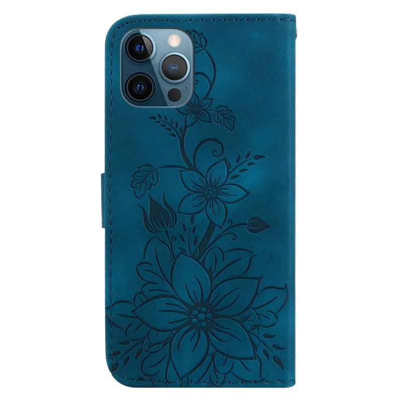 For iPhone 12 Pro Max Lily Embossed Leather Phone Case(Dark Blue)