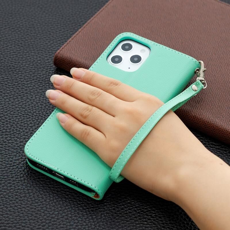 Θήκη δέρματος οριζόντιας αναδίπλωσης με υφή Litchi, απλό χρώμα για iPhone 12 Pro Max με βάση, θήκες καρτών, πορτοφόλι και κορδόνι (Πράσινο)
