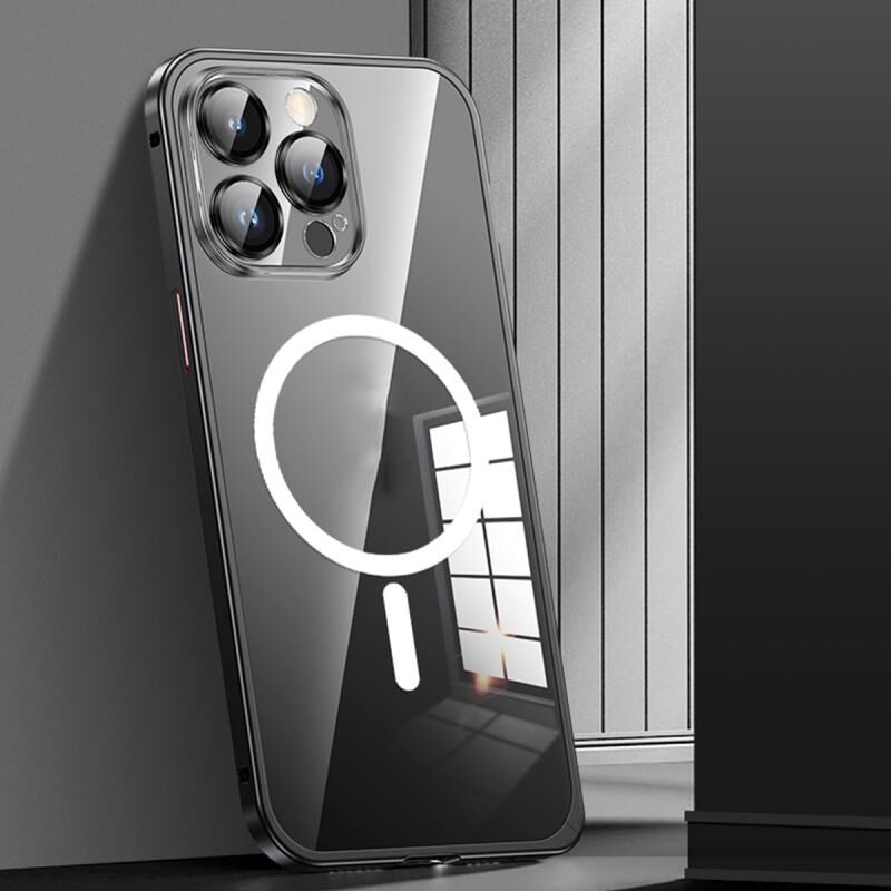 For iPhone 12 Pro Max MagSafe Spring Buckle Metal Transparent Phone Case with Lens Protection(Black)