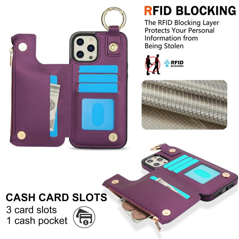 For iPhone 12 Pro Max RFlD Anti-theft Double Buckle Ring Zipper Card Phone Case(Dark Purple)