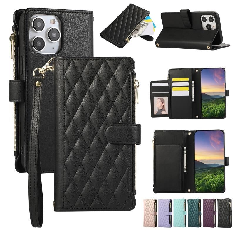 For iPhone 12 Pro Max Rhombic Zipper Wallet Leather Phone Case(Black)