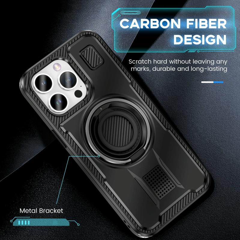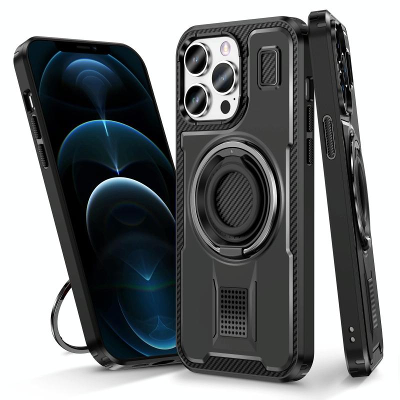 For iPhone 12 Pro Max Ring Holder Carbon Fiber PC Hybrid TPU Phone Case(Black)