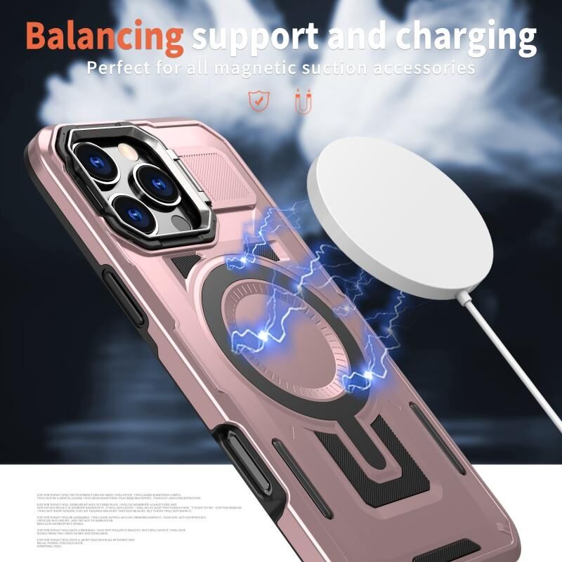 For iPhone 12 Pro Max Shield Hollow Frame Holder MagSafe Phone Case(Rose Gold)