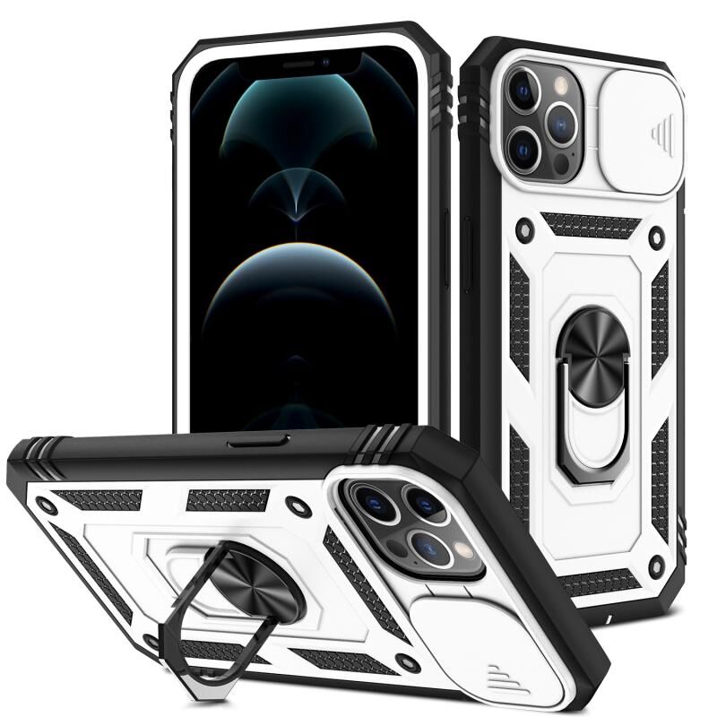 Θήκη προστασίας TPU + PC για iPhone 12 Pro Max με σχεδιασμό συρόμενης κάμερας, περιστρεφόμενη βάση 360 μοιρών & υποδοχή κάρτας (Λευκό+Μαύρο)