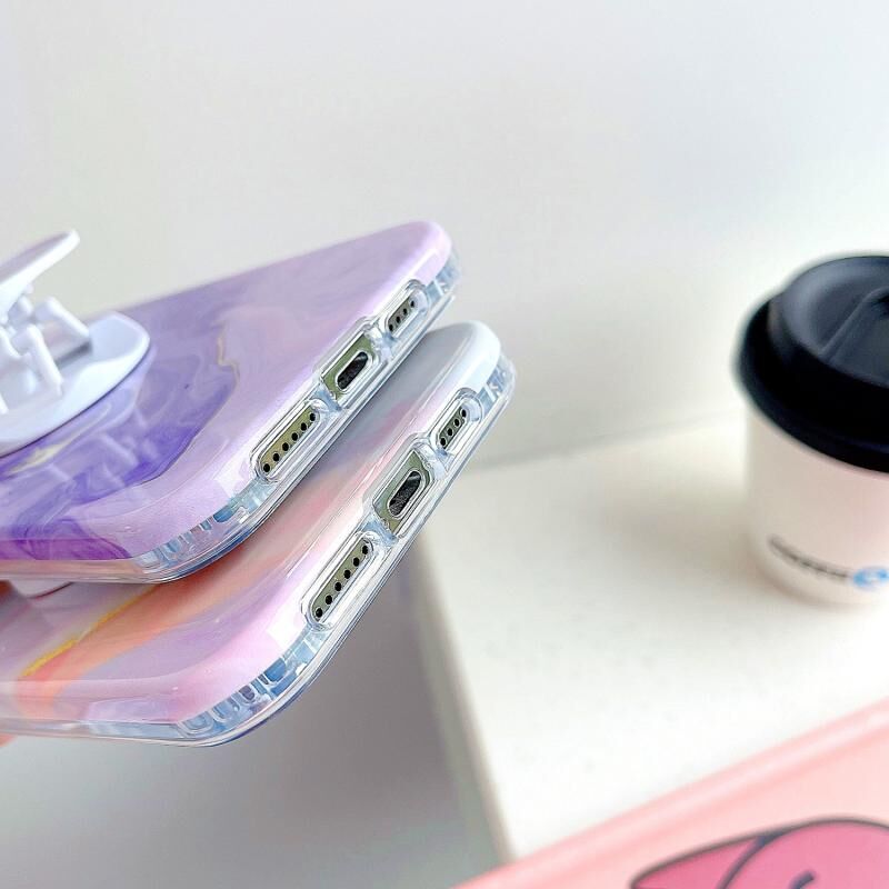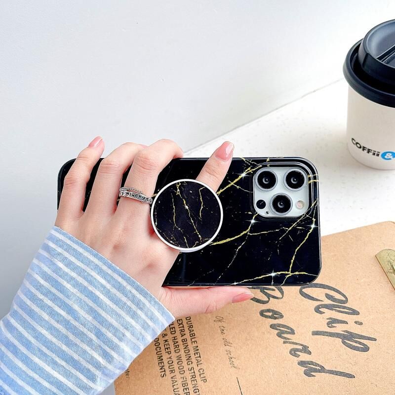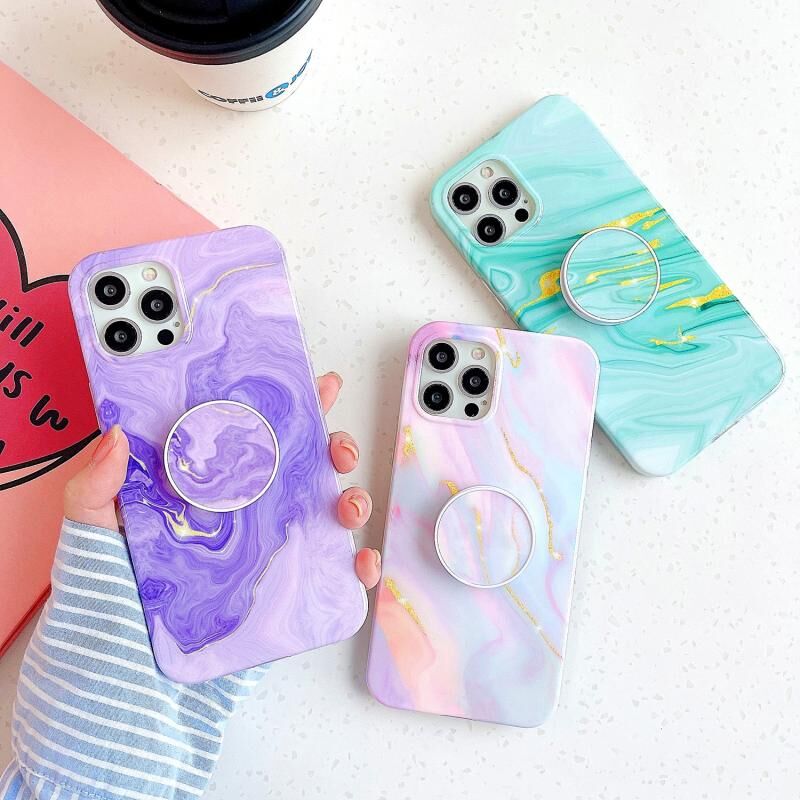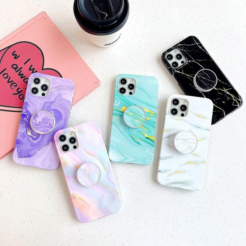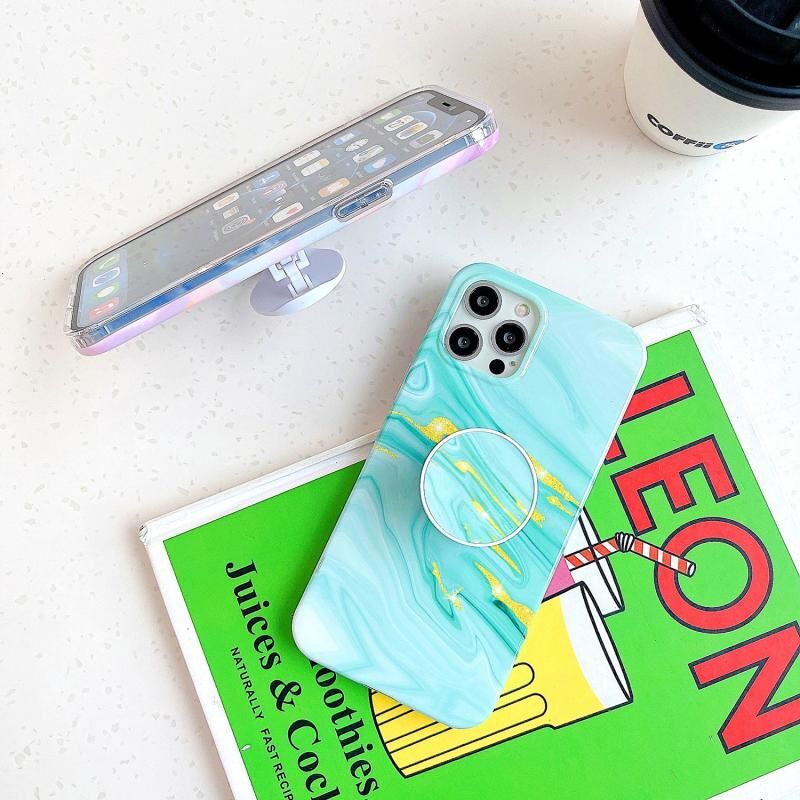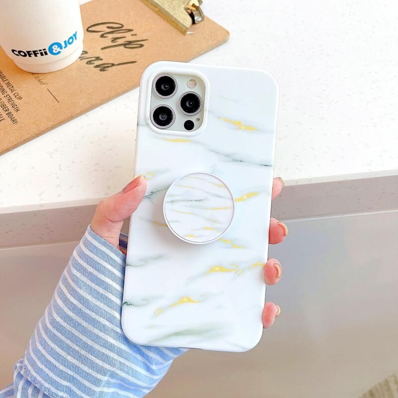 Θήκη για iPhone 12 Pro Max από παχύτερο TPU με γυαλιστερό σχέδιο μαρμάρου και πτυσσόμενη βάση (Λευκό)