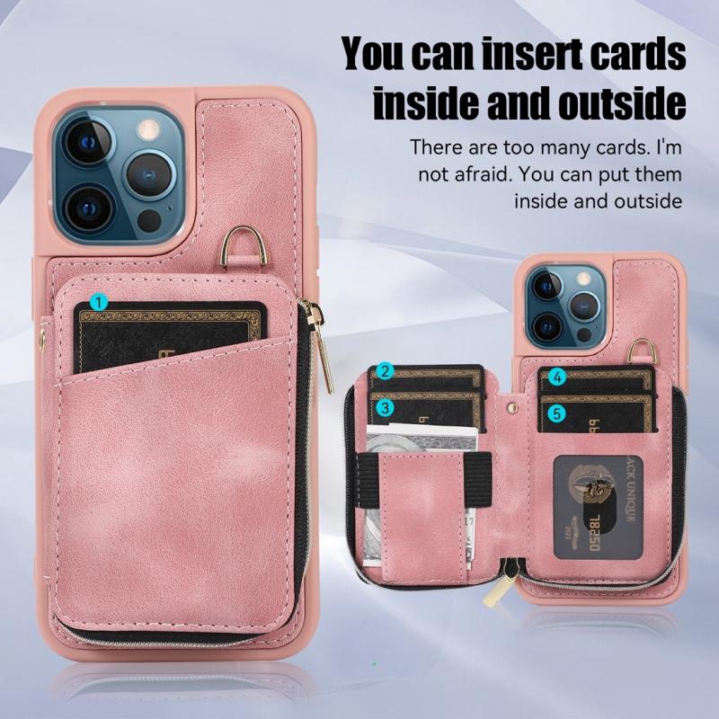 For iPhone 12 Pro Max Zipper Card Bag Back Cover Phone Case(Pink)