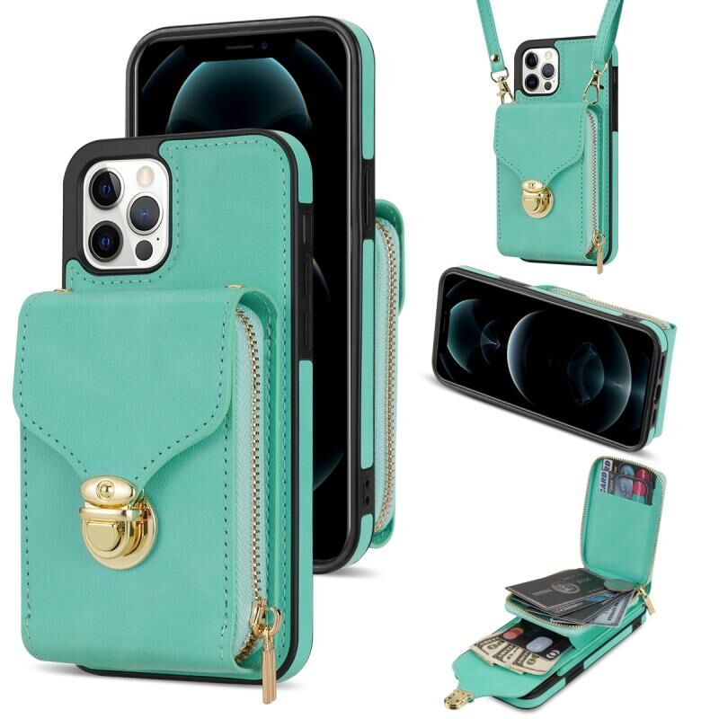 For iPhone 12 Pro Max Zipper Hardware Card Wallet Phone Case(Mint Green)