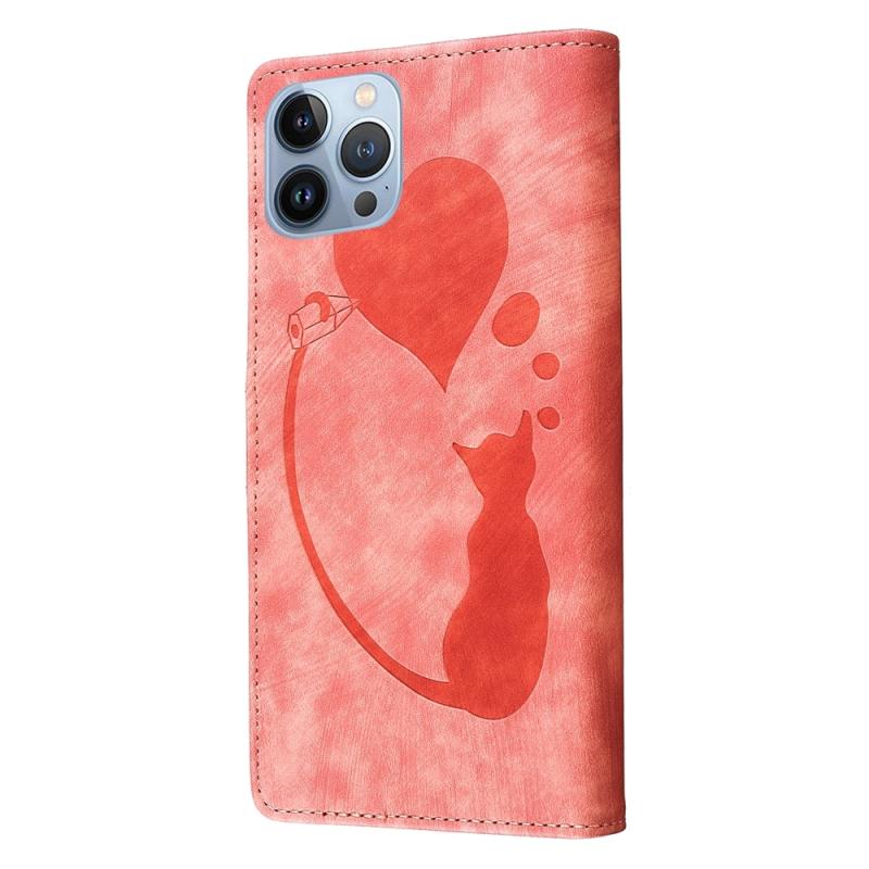 For iPhone 12 Pro Pen Heart Cat Embossed Leather Phone Case(Orange)