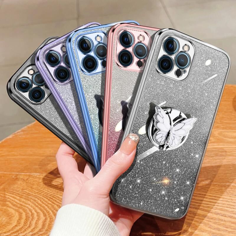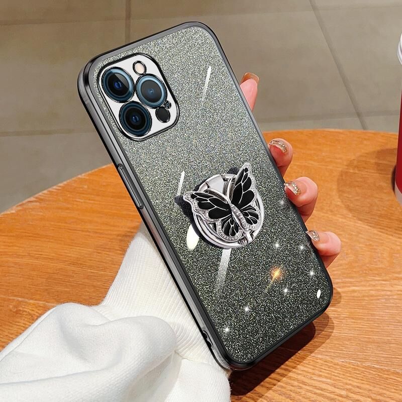 For iPhone 12 Pro Plated Gradient Glitter Butterfly Holder TPU Phone Case(Black)