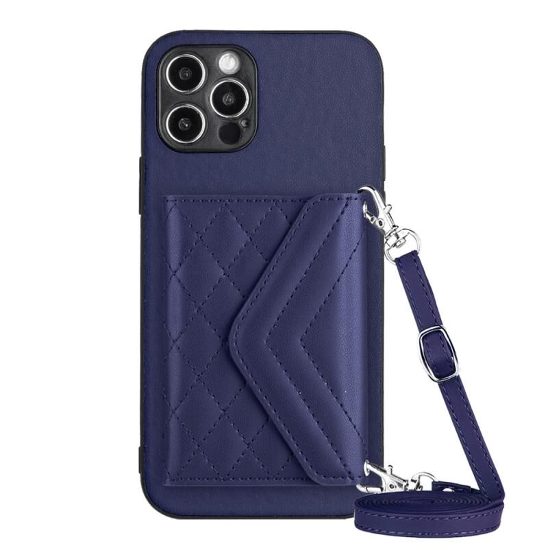 For iPhone 12 Pro Rhombic Texture Card Bag RFID Phone Case with Long Lanyard(Blue)