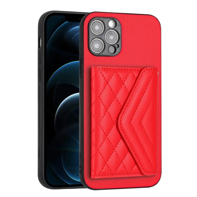 For iPhone 12 Pro Rhombic Texture Card Bag RFID Phone Case with Long Lanyard(Red)