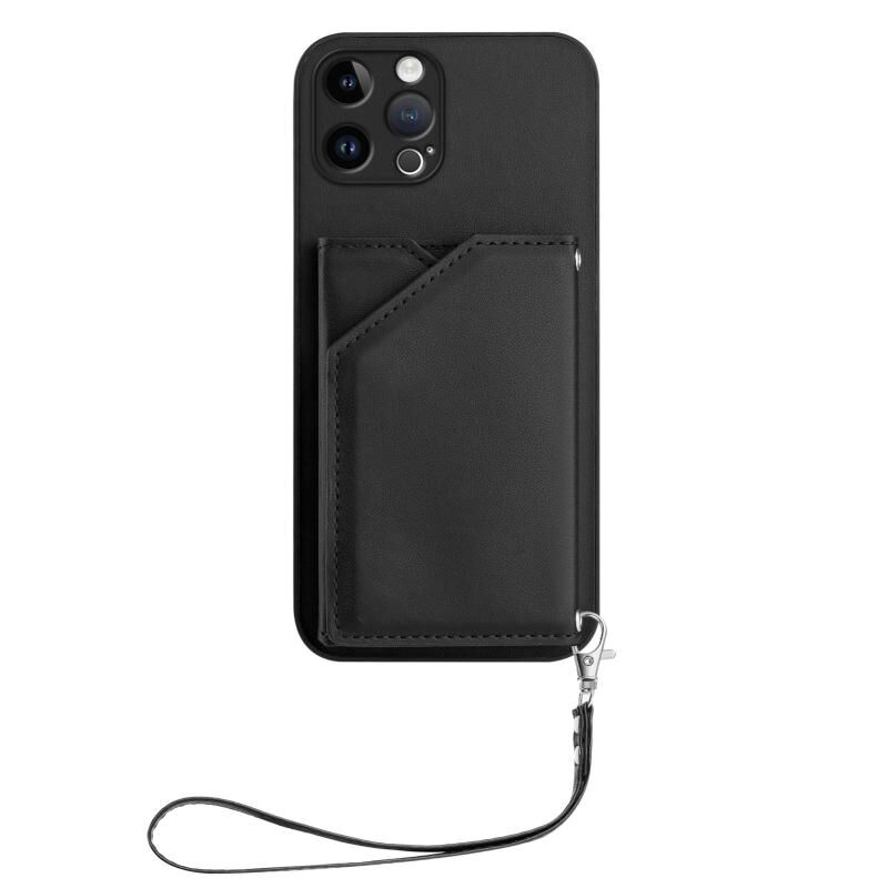 Θήκη τηλεφώνου για iPhone 12 Pro με αίσθηση δέρματος, τέσσερις θήκες για κάρτες και λουρί καρπού (Μαύρο)